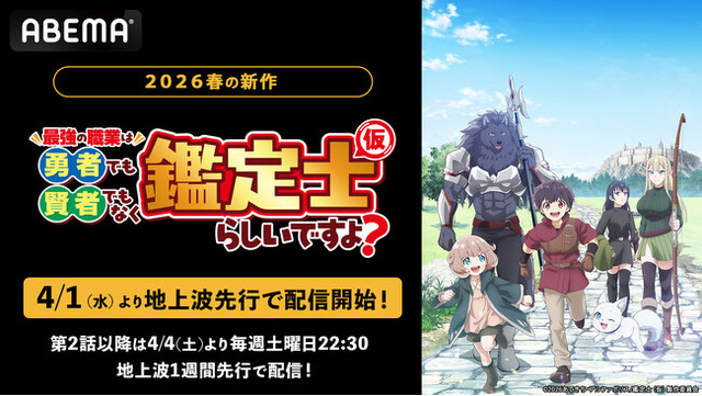 新しい未来のテレビ「ABEMA」は、2026年新作春アニメ『最強の職業は勇者でも賢者でもなく鑑定士(仮)らしいですよ?』を、2026年4月1日(水)より、地上波先行・WEB最速配信いたします。