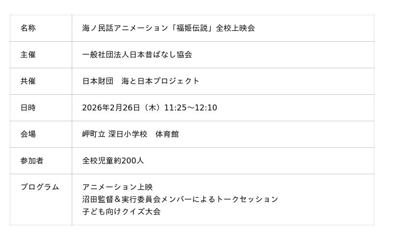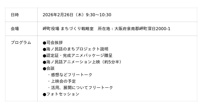 一般社団法人日本昔ばなし協会が取り組む「海ノ民話のまちプロジェクト」は、2026年2月26日(木)に大阪府岬町を舞台にした海ノ民話アニメーション「福姫伝説」が完成したため、アニメ監督が岬町を訪問しアニメのお披露目と「海ノ民話のまち」認定式を実施しました。
