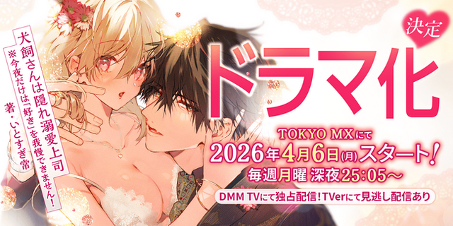 株式会社ぶんか社(本社:東京都千代田区、代表取締役:今晴美)の人気TLマンガ『犬飼さんは隠れ溺愛上司 ※今夜だけは「好き」を我慢できません!』(いとすぎ常・著)がドラマ化決定!4月6日(月)深夜25:05より、TOKYO MXで放送、DMM TVにて独占配信をスタートします。
