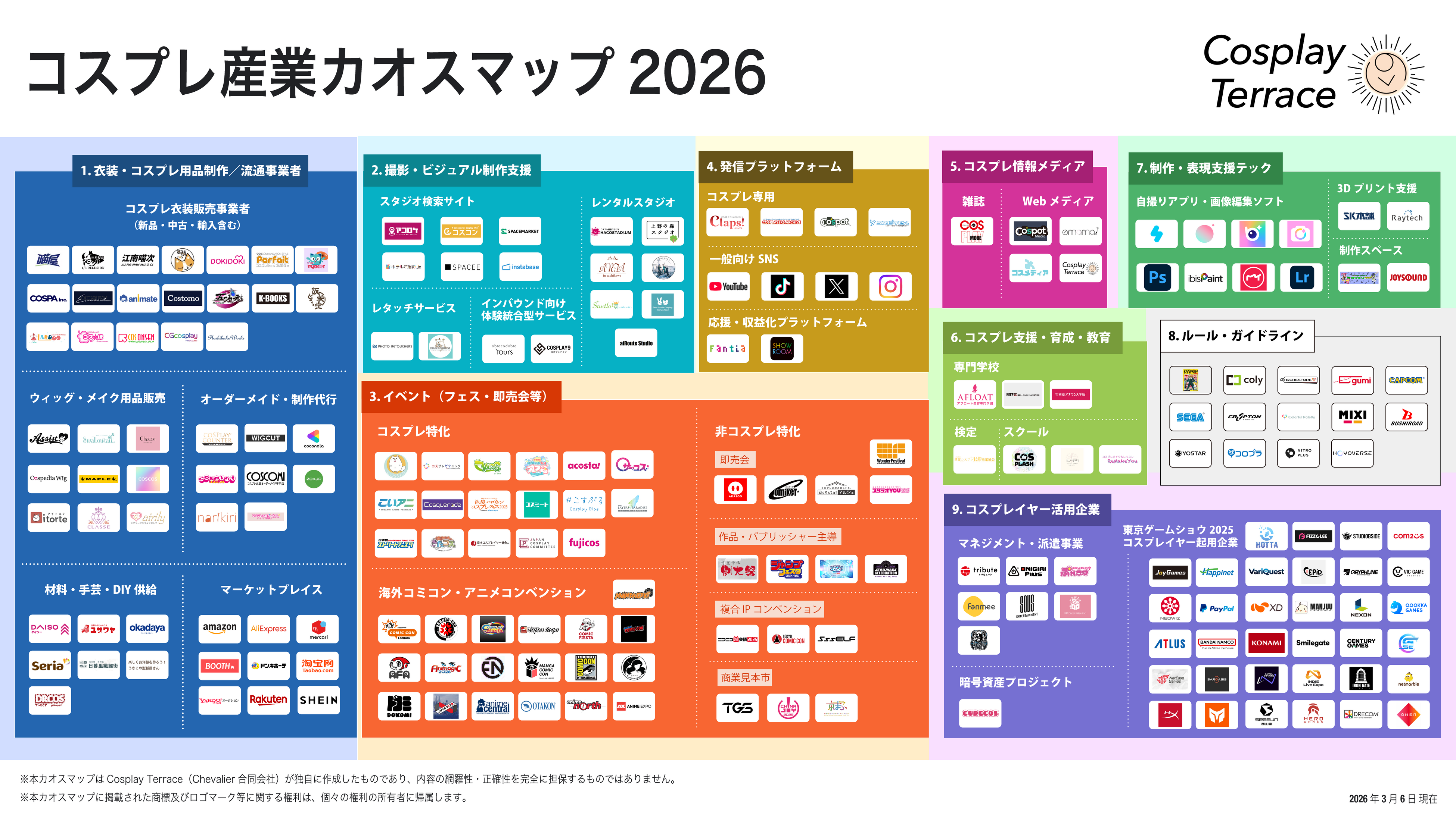 ・本資料は、コスプレ産業に関連する事業者・活動領域の構造を可視化し、産業全体の理解促進を目的として作成したものです。特定の企業、団体、プロジェクト、個人等の合法性、健全性、信用性、将来性その他の評価、保証、推奨を行うものではありません。