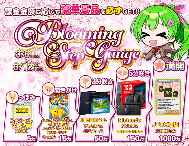 株式会社日本トレカセンター(本社:東京都、代表取締役CEO:大山 敏浩)は、オンラインオリパサービス「日本トレカセンター」において、2026年3月6日(金)15:00より、春の新生活を応援する期間限定イベント「Blooming Step Gauge(ブルーミング ステップ ゲージ)」を開催いたします。