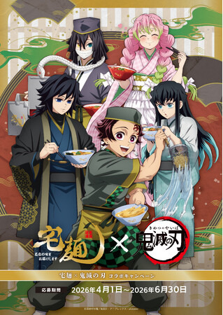 グルメエックス株式会社(本社:東京都港区、代表取締役社長:冨澤 文秀)は、2026年4月1日よりアニメ『鬼滅の刃』とのコラボラーメンを発売します。本コラボ企画では、宅麺の主力ブランド「宅麺」と、新発売の鍋一つで5分で作れるお手軽なセカンドラインブランド「らくうまっ宅麺*」から各2商品(計4商品)展開します。宅麺限定イラストカード(全10種)を封入するほか、オリジナルラーメンどんぶり、レンゲなどのグッズが抽選で当たるキャンペーンも実施します。また、東急プラザ渋谷の「宅麺らぁめん横丁 in Pepper PARLOR」とマルイ店舗では、期間限定のイートイン提供も行います。今回のコラボレーションでは竈門炭治郎たち5人の鬼殺隊メンバーが描き下ろされ、購入特典ノベルティのデザインやコラボグッズなどに使用されています。