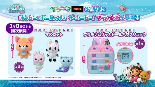 株式会社イオンファンタジー(本社:千葉県千葉市、代表取締役社長:藤原徳也、以下、当社)は、映画『ギャビーのドールハウス ザ・ムービー』の当社限定プライズゲーム用景品2アイテム「プラチナムザッカドールハウスリュック」、「マスコット」を「モーリーファンタジー」「PALO」をはじめとするアミューズメント施設、オンラインクレーンゲーム「モーリーオンライン」等において、映画の公開に合わせ3月13日(金)より順次展開いたします。