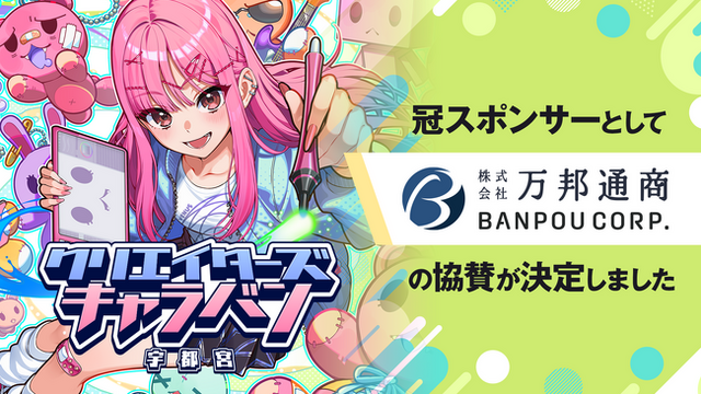 [画像1: https://prcdn.freetls.fastly.net/release_image/135959/49/135959-49-c56247056ff5c83ad99e012610ddd557-1920x1080.png?width=536&quality=85%2C75&format=jpeg&auto=webp&fit=bounds&bg-color=fff ]この度、株式会社トライデントワークスが主催する地方発・エンタメ業界の交流イベント『クリエイターズキャラバン宇都宮』の冠スポンサーとして『株式会社万邦通商』が協賛決定したことをお知らせいたします。