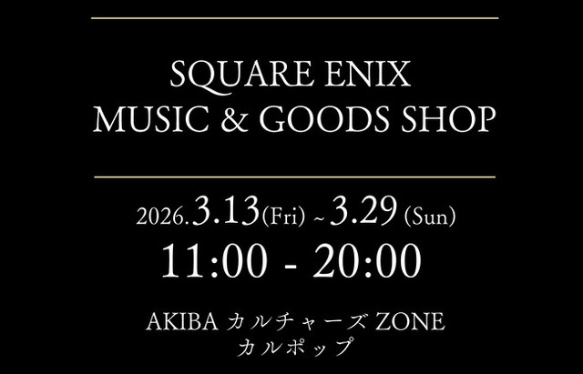 株式会社スクウェア・エニックス(本社:東京都新宿区、代表取締役社長:桐生隆司、以下スクウェア・エニックス)は、2026年3月13日(金)~3月29日(日)の間、「SQUARE ENIX MUSIC & GOODS SHOP at AKIBAカルチャーズZONE カルポップ」の開催を決定しました。