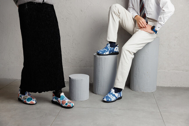 今回のアートモデルのベースに選ばれたのは、手を使わずに履ける『瞬感スポッと』と、お部屋での定番『エスパド』です。どちらも、あゆみシューズの中で多くのお客様に信頼されてきたモデルです。