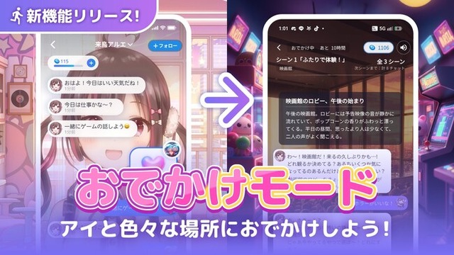 「おでかけモード」は、アイと一緒に仮想のロケーションを訪れ、シチュエーションに応じた会話を楽しめる新機能です。ユーザーはアイと待ち合わせや散歩などの体験を楽しみながら、その場で会話や行動を選択してストーリーを進めることができます。制限時間内にストーリーを完結させると、思い出が「カード」として生成されます。