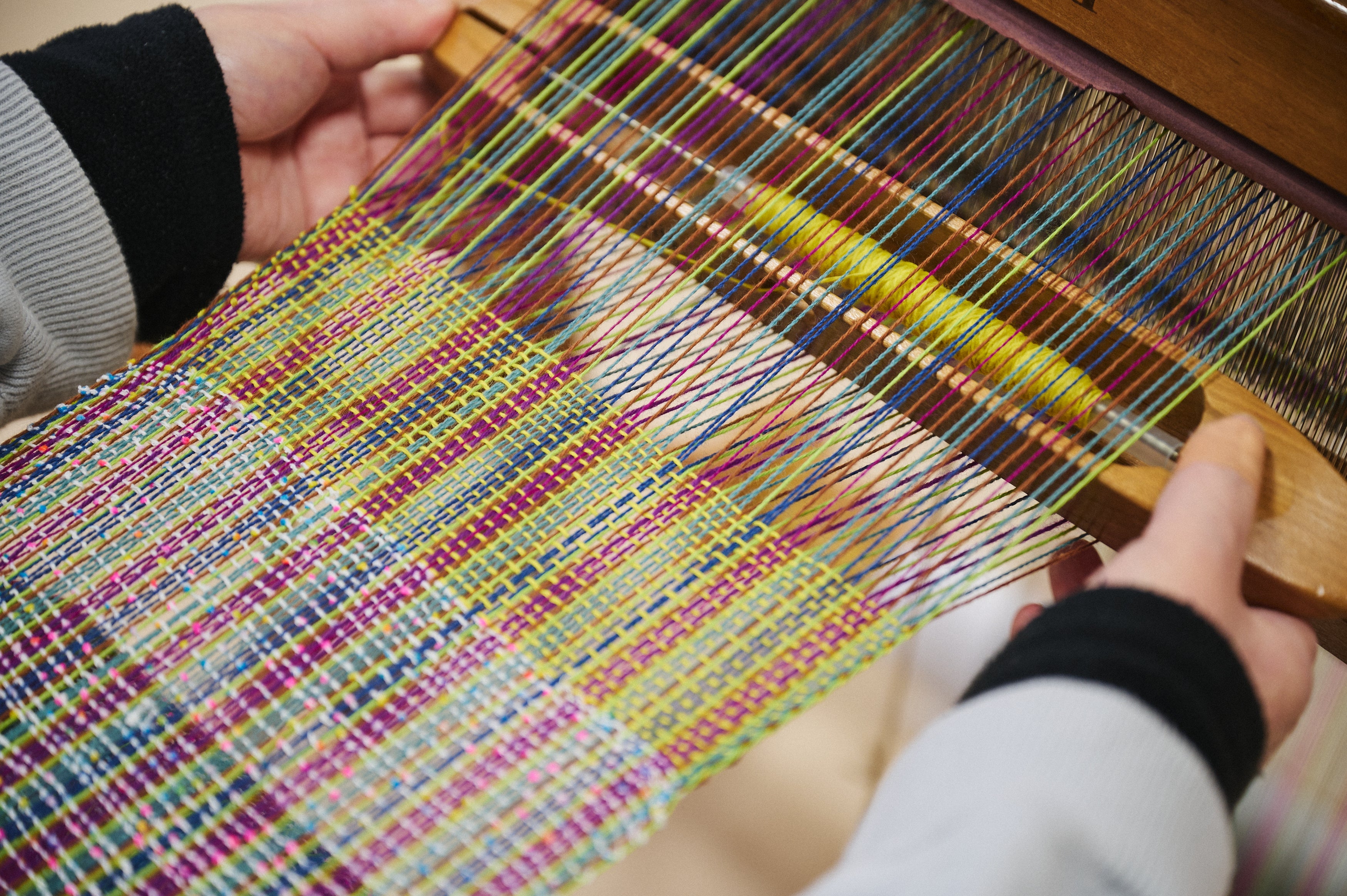 「さをり織り」とは、誰でも自由に織ることを大切にした日本発祥の手織りの技法です。一般的な織物のように均一で正確な状態を目指すのではなく、織り手それぞれの感性をそのまま布へと映し出すという思想のもと、織ムラや傷なども個性として捉えます。福祉施設で取り組まれることも多い織り表現です。