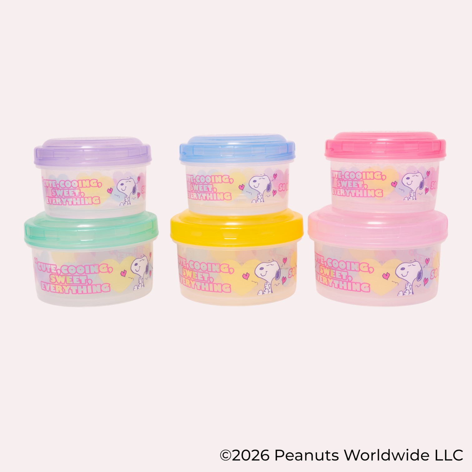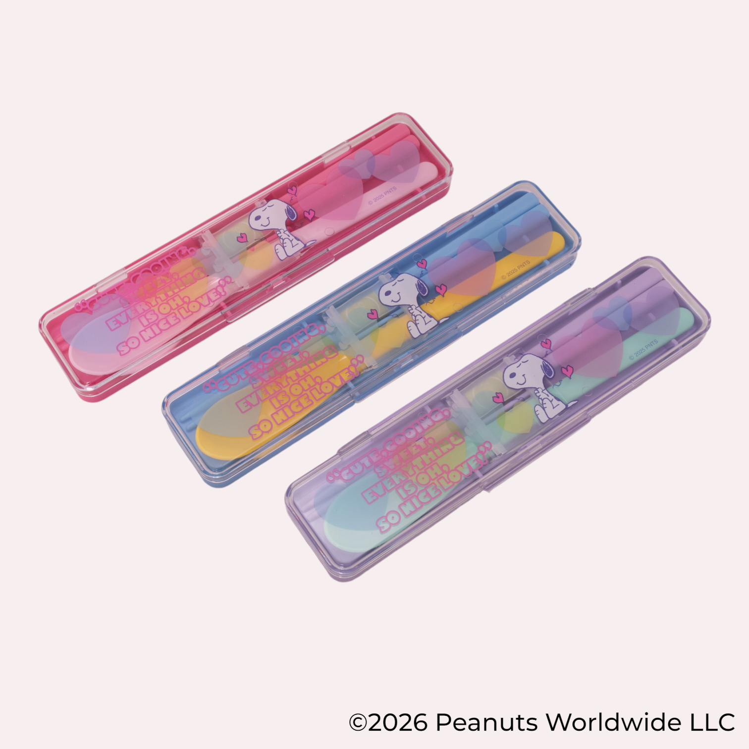 本シリーズは、透明感のある素材に色鮮やかなハートと「スヌーピー」が描かれており、食卓やランチタイムを華やかに彩ります。