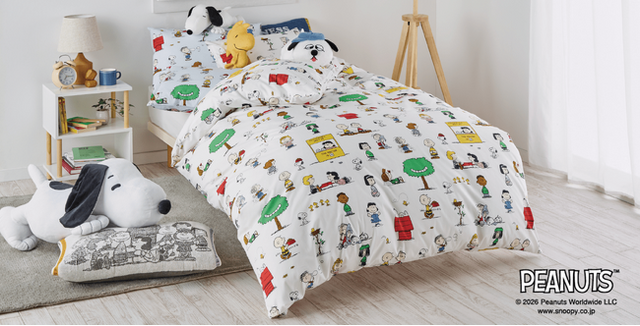 2026年春夏シーズンは、コミックに登場する仲間たち「ピーナッツ・ギャング」が大集合した、楽しくてかわいいアートが魅力のシリーズ「PEANUTS GANG COLLECTION」が新登場。掛けふとんカバー、ピローケース、タオルケットなどを展開します。また、スヌーピーと仲間たちがビーチでハッピーに楽しむデザインの「SUMMER BEACH COLLECTION」では、サラッとした素材で暑い夏も快適に使えるクールケットが登場。新生活のスタートにぴったりな、カラフルで明るいベッドルームを演出します。