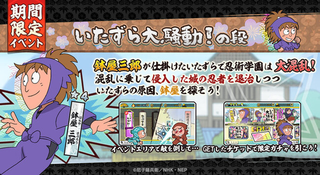 合同会社ナルコナル(本社:東京都港区、代表取締役社長 谷口祐一郎)は、スマートフォン向けゲーム『忍たま乱太郎 ふっとびパズル!の段 あげいん!』において、期間限定イベント「いたずら大騒動!の段」の開催及び、新たなキャラクターとして保健委員のメンバー4名を追加することをお知らせいたします。
