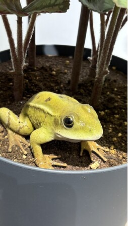 一見すると何気なく置かれた植物の鉢ですが、その前を通りがかると、どこからともなく子どもの声が聞こえてきます。声の出どころを探して身を屈めると、鉢の葉陰から一匹のカエルが姿を現します。