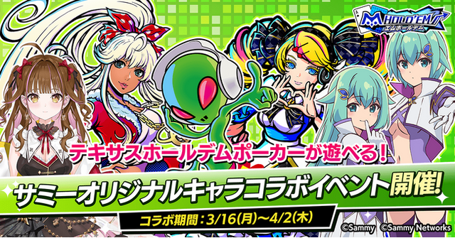 サミー株式会社(本社:東京都品川区 代表取締役 社長執行役員 COO:星野 歩)のスマートフォン向けテキサスホールデムポーカーアプリ「m HOLD’EM(エムホールデム)」は、サミーオリジナルキャラクターとのコラボイベントを2026年3月16日(月)から4月2日(木)まで開催いたします。