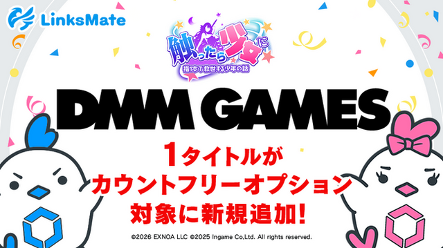 株式会社LogicLinks(以下LogicLinks、本社:東京都渋谷区、代表取締役社長:春田 康一)は、MVNOサービス「LinksMate」において2026年3月12日(木)よりカウントフリーオプション対象コンテンツとして合同会社EXNOA(本社:東京都港区、CEO:東條 寛)が提供するオンラインゲームプラットフォーム『DMM GAMES』にて配信中の「触ったら少女に~指一本で救世する少年の話~」を新たに追加することをお知らせいたします。
