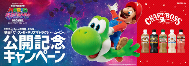 サントリー食品インターナショナル(株)は、「クラフトボス」と話題の新作映画『ザ・スーパーマリオギャラクシー・ムービー』とコラボレーションし、3月16日(月)から公開記念キャンペーンを実施します。翌日3月17日(火)の、「クラフトボス ブラック」「同 ラテ」「同 ミルクラテ」の主力3商品リニューアルに合わせ、話題化を狙います。