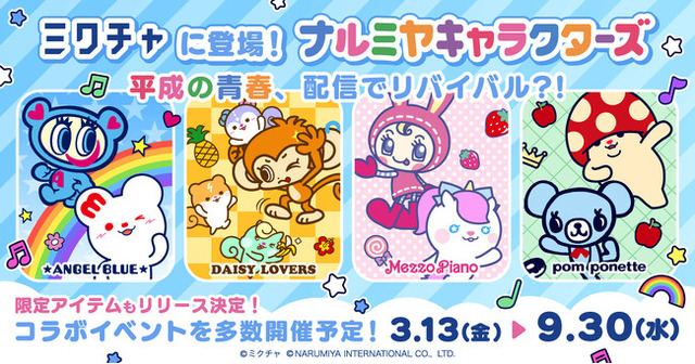 現在、SNSを中心に2000年代前後のファッションやカルチャーを再解釈した「Y2K」ブームが定着し、かつて女子小学生の間で社会現象となったジュニアアパレルブランド「ANGEL BLUE(エンジェルブルー)」「mezzo piano junior(メゾピアノ ジュニア)」「pom ponette junior(ポンポネット ジュニア)」「DAISY LOVERS(デイジーラヴァーズ)」の人気キャラクターたち「ナルミヤキャラクターズ」が世代を超えて熱狂的な支持を集めています。当時の「平成女児」だった世代にとっては「エモすぎる再会」であり、そうでない世代にとっては「新しくてポップなアイコン」として全世代を繋ぐ強力なキャラクターたちが、ついに「ミクチャ」のライブ配信空間で新たな熱狂を創造します。平成の街中を彩ったあのワクワク感を令和のスマホ画面の中に再現し、“懐かしいのに新しい”体験をユーザーの皆様にお届けします。■コラボ内容