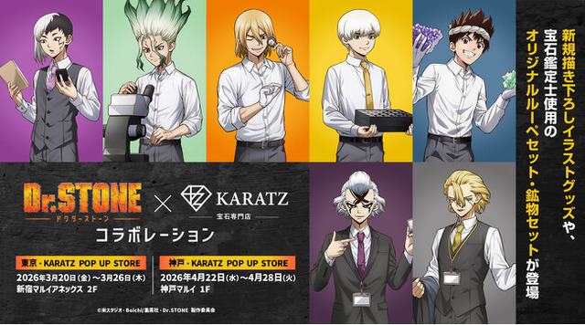 TVアニメ「Dr.STONE」の世界観を、宝石専門店KARATZならではの視点で形にしました。描き下ろしイラストグッズに加え、実際に宝石鑑定士が使用するルーペや、作品に登場する鉱物をモチーフにしたコレクションセットなど、“科学に触れる体験”を楽しめるアイテムを展開します。大人から子どもまで、知的好奇心を刺激するラインナップです。販売について
