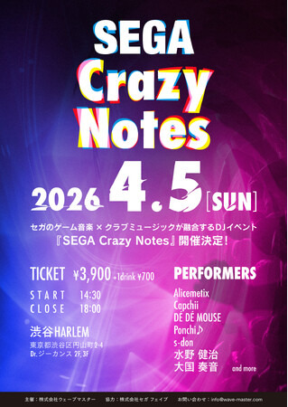セガグループの株式会社ウェーブマスター(本社:東京都品川区、代表取締役社長:清水 信彦、以下 ウェーブマスター)は、株式会社セガ フェイブ(本社:東京都品川区、代表取締役社長執行役員:杉野行雄、以下 セガ フェイブ)協力のもと、DJイベント『SEGA Crazy Notes』を2026年4月5日(日)開催いたします。