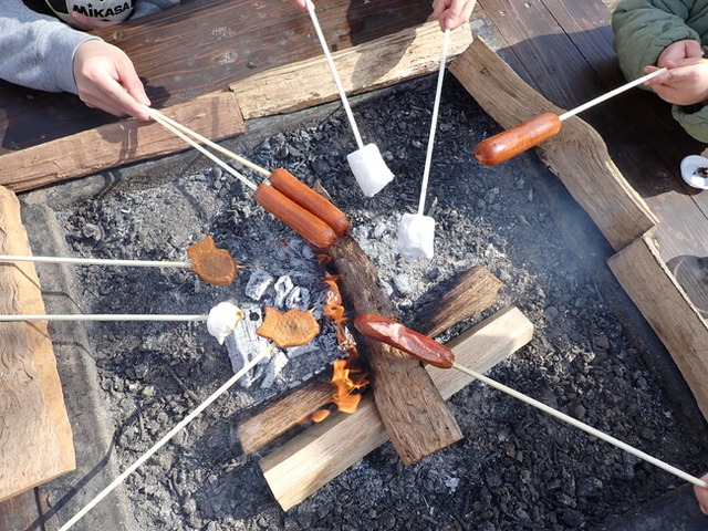 スタッフに炙り方も教えてもらい焚火で一段と美味しく