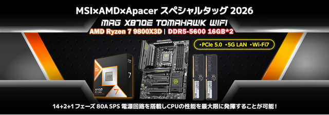 「MSI×AMD スペシャルタッグ 2026」は、MSI社製のX870Eマザーボード「MAG X870E TOMAHAWK WIFI」をはじめ、CPUに「AMD Ryzen 7 9800X3D」または「AMD Ryzen 7 9700X」、メモリーにApacer社製のDDR5 16GBメモリー2枚をセットにしたキット製品です。PCI Express 5.0対応デバイスをサポートするほか、5ギガビットLANやWi-Fi 7モジュールを備えており、お好みのゲーミングPCを組み立てることが可能です。