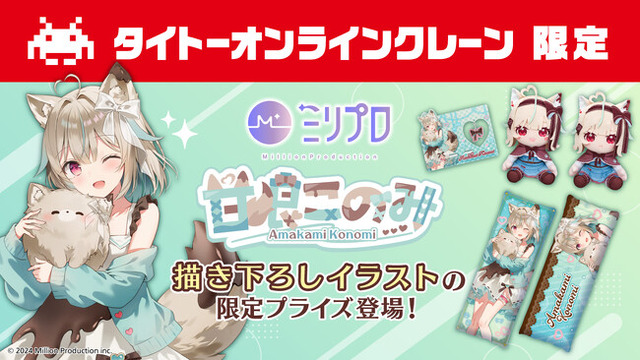 株式会社タイトー(本社:東京都新宿区、以下タイトー)が運営する、おうちでクレーンゲームが楽しめる「タイトーオンラインクレーン(以下タイクレ)」にて、株式会社Million Production(以下、ミリプロ)所属VTuber甘狼このみさんとのコラボレーションを実施します。コラボレーションを記念し、新規描き下ろしイラストを使用したプライズを、3月26日(木)20時よりタイクレ限定で展開します。さらに、同日19時からは、甘狼このみさんYouTubeチャンネルにて、ご本人が限定プライズの獲得に挑戦する生配信を予定しています。