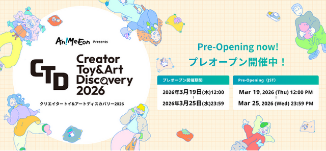 「Creator Toy & Art Discovery 2026 (CTD)」は、世界中に日本のポップカルチャーアイテムを届けるオンラインショッピングサイト「AniMeEon」(アニミオン)が初開催する期間限定のグローバルオンラインマーケットです。「あたらしい発見と探求」をテーマに、国内クリエイター150名以上が参加し、アートトイ、イラスト、雑貨など個性豊かなクリエイターズアイテムを販売します。