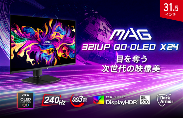 この度、エムエスアイコンピュータージャパン株式会社は2026年03月26日(木)より、ゲーミングモニターの新モデルを発売いたします。高いゲーミング性能とコストパフォーマンスを両立した『MAG』シリーズから、QD-OLEDパネルと次世代ダークアーマー・フィルムを組み合わせにより、改良された深い黒と鮮やかな色彩を両立し、4K UHDの高解像度に加えリフレッシュレート240Hz、応答速度0.03(GTG)の高いゲーミング性能を備えた「MAG 321UP QD-OLED X24」が新たにラインナップに加わります。