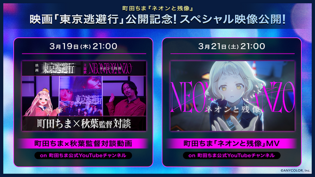 ANYCOLOR株式会社(本社:東京都港区 代表取締役:田角陸、以下「当社」)が運営するVTuber / バーチャルライバーグループ「にじさんじ」は、映画『東京逃避行』の主題歌である町田ちまのオリジナル楽曲「ネオンと残像」に関する情報を公開いたします。