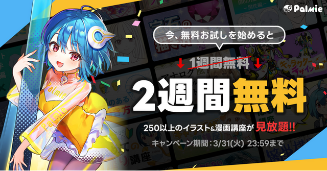 株式会社パルミー(所在地:東京都港区、代表取締役:大野英紀、以下パルミー)が運営する「お絵かき講座パルミー」では、本日2026年3月19日(木)12時00分より、無料お試し期間2倍キャンペーンを開催いたします。