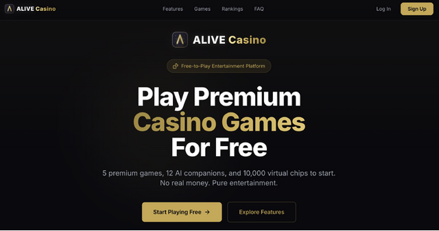 ALIVE Casinoは、リアルマネーを一切使用しない完全無料のオンラインカジノゲームプラットフォームです。登録するだけで10,000枚のバーチャルチップが付与され、すぐにプレイを開始できます。最大の特徴は、12体のユニークなAIコンパニオンがプレイヤーに寄り添い、プレイスタイルを記憶しながら応援してくれる独自のAI体験です。