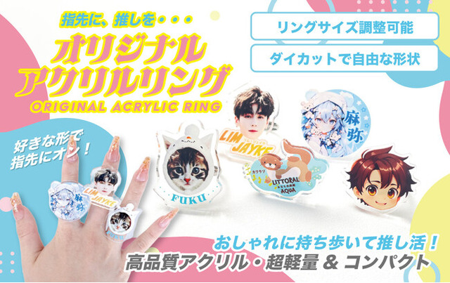 [画像2: https://prcdn.freetls.fastly.net/release_image/60781/38/60781-38-b3bb245db451e0214777a5a1256ffced-1080x680.jpg?width=536&quality=85%2C75&format=jpeg&auto=webp&fit=bounds&bg-color=fff ]オリジナル アクリルリング(指輪)は、指先という視認性の高い場所で推しを楽しめる、新しいトレンドアクセサリーです。写真や動画撮影時にも自然とフレームに入りやすいため、SNS投稿との相性も抜群。日常のワンシーンでもさりげなく“推し”をアピールでき、世界観のあるひと時を演出します。イベント物販やキャンペーン施策にも効果的な、話題を呼ぶアイテムです。