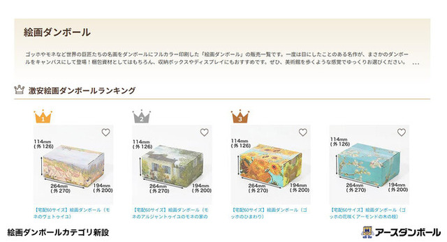ゴッホやモネなど世界の巨匠たちの名画をダンボールにフルカラー印刷した『絵画ダンボール』の販売ページを用意。一度は目にしたことのある名作が、ダンボールをキャンバスにして続々登場。