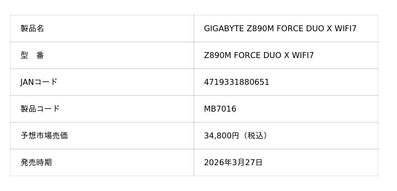 株式会社ニューエックス(本社:東京都千代田区)は、取り扱いメーカーであるGIGABYTEより、Intel Z890チップセットを搭載した上 Micro-ATX マザーボードの「GIGABYTE Z890M FORCE DUO X WIFI7」を2026年3月27日(金)に発売いたします。