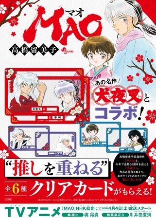 デザインは『MAO』から摩緒(2種)と菜花、『犬夜叉』から犬夜叉、殺生丸、かごめの全6種。クリア素材となっているので、2枚で重ねても楽しめます。摩緒と菜花といった同作の登場人物だけでなく、摩緒と犬夜叉など作品の垣根を超えたコラボもできるので、ぜひ手に入れてください!