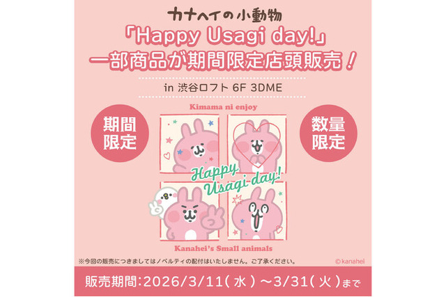 株式会社イメージ・マジック(東京都文京区、代表取締役社長:山川 誠)は、人気キャラクター「カナヘイの小動物」の「うさぎ」の誕生日を祝した「Happy Usagi day!」記念グッズを、渋谷ロフト6階「3DME(スリーディーミー)」エリアにて、2026年3月11日(水)から3月31日(火)までの期間限定で販売しております。
