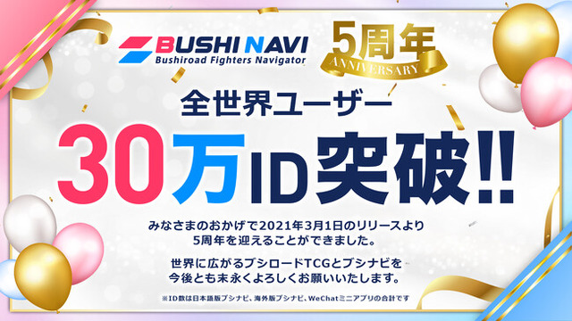 [画像1: https://prcdn.freetls.fastly.net/release_image/14827/9376/14827-9376-3fde51740ba2df0ab06fc2fd2dcd8ffa-1920x1080.jpg?width=536&quality=85%2C75&format=jpeg&auto=webp&fit=bounds&bg-color=fff ]2021年3月1日にリリースしましたブシロード公式TCGツール「ブシナビ」が、5周年を迎えるとともに、全世界ユーザーの合計登録ID数が30万IDを突破しました。(2026年3月1日時点)