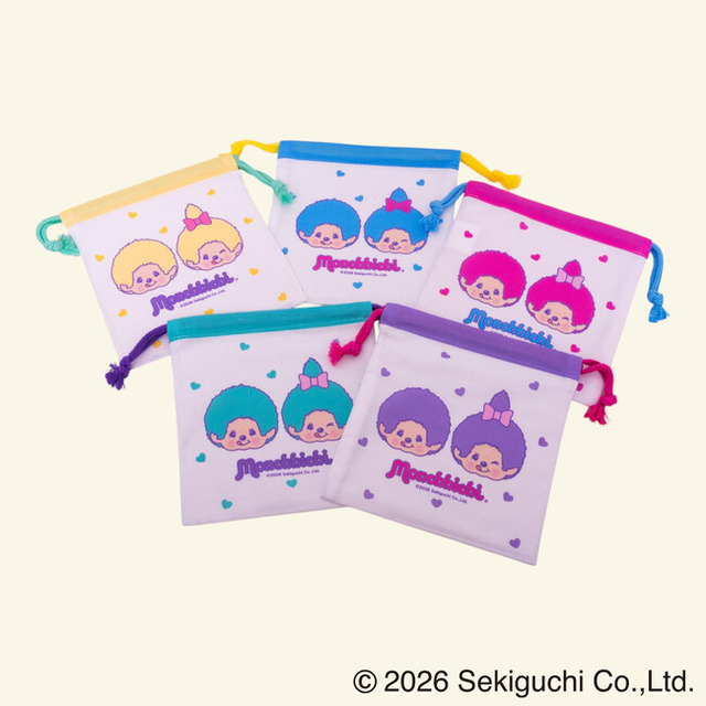 巾着のデザインは、表面に「モンチッチくん」と「モンチッチちゃん」の顔を大きくプリントし、裏面にはフルーツや星などのモチーフを散りばめたポップな総柄を採用しています。