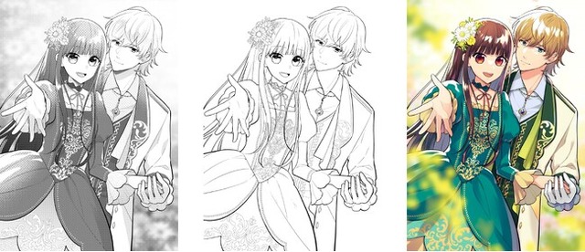 画像処理の比較 左:製版データ(スクリーントーンあり)、中:eComicScreen ReMでのトーン除去後※2、右:カラーリング後 ※2 eComicScreen ReMは、トーン除去までを担当します