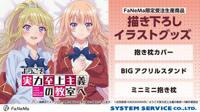 システムサービス株式会社(本社:東京都豊島区、代表取締役社長:田村宗弘)は、アニメ・マンガ・ゲーム作品等のキャラクター商品の企画・製作・販売をする自社ECサイト「FaNeMa」(URL:https://fanema.jp/)にて、TVアニメ『ようこそ実力至上主義の教室へ』より「抱き枕カバー」「ミニミニ抱き枕」「BIGアクリルスタンド」を発売いたします。