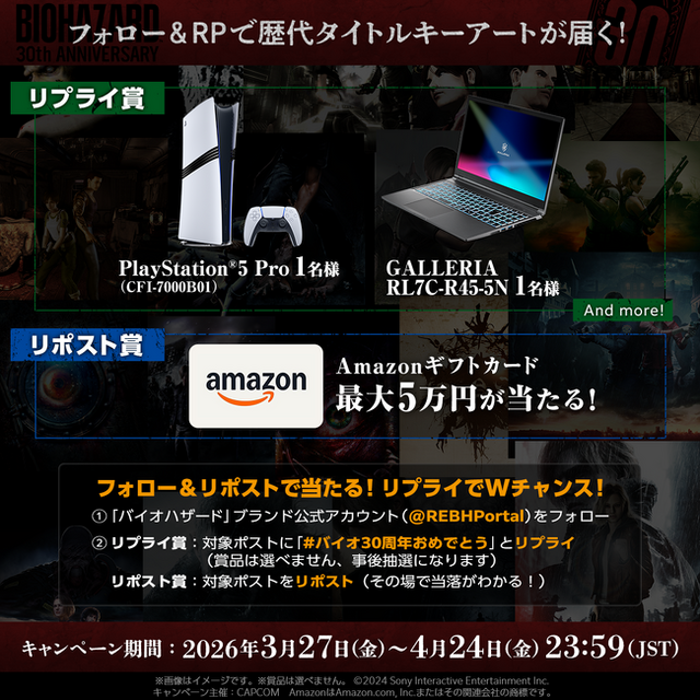 「バイオハザード」ブランド公式X(旧Twitter)(@REBHPortal)において、3月27日(金)より、抽選でGALLERIA ゲーミングノートPCやPlayStation(R)5 Proが当たる、「バイオハザード」シリーズ30周年記念キャンペーンを実施いたします。