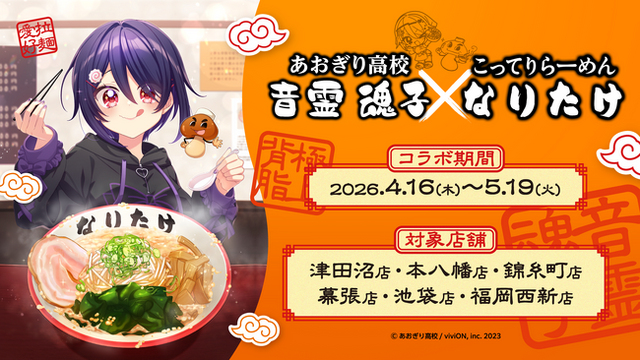 株式会社viviON(所在地: 東京都千代田区、 代表取締役: 明石耕作)は、 運営するVTuberグループ「あおぎり高校」所属の音霊魂子(おとだま たまこ)と、 背脂ラーメンの銘店『こってりらーめん なりたけ』(運営: 有限会社なりたけ)による初のコラボレーションフェアを、 2026年4月16日(木)より全国6店舗にて開催いたします。