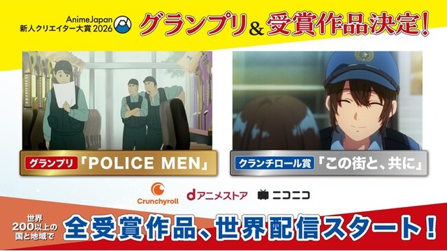 京都精華大学『POLICE MEN』がグランプリに輝いたほか、AnimeJapan特別賞にはHAL名古屋『この街と、共に』、HAL大阪『夏のおもかげ』、京都精華大学『POLICE MEN』、東京工芸大学『Live in Red』の4作品が選出されました。あわせて、HAL名古屋『この街と、共に』がクランチロール賞、京都精華大学『Offbeat』が技術賞、『永夜のレクイエム』が演出賞、HAL東京『まごころむすび~ぎゅっとコメる想い~』がキャラクター賞、HAL大阪『夏のおもかげ』が美術賞を受賞し、それぞれの分野で光る表現力が高く評価されました。●グランプリ