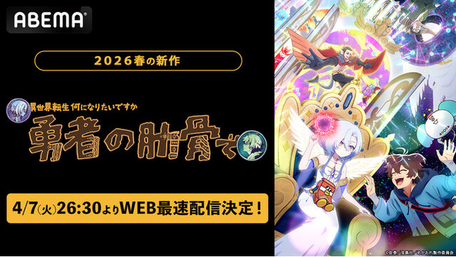 新しい未来のテレビ「ABEMA」は、2026年新作春アニメ『女神「異世界転生何になりたいですか」俺「勇者の肋骨で」』を、2026年4月7日(火)から毎週火曜日26時30分より、WEB最速配信いたします。
