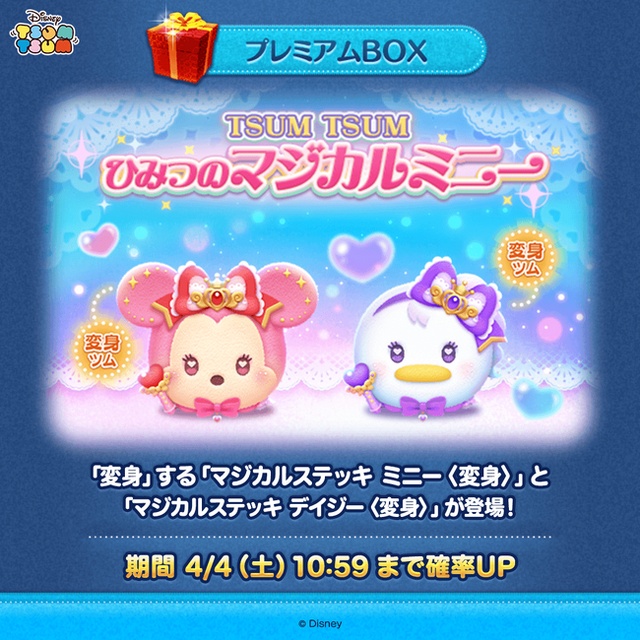 4月1日(水)より、ゲーム内イベント「TSUM TSUM ひみつのマジカルミニー」が開催されます。本イベントではミッションをクリアして5つのジュエルの色を変化させることで、物語が次々と展開していきます。クリアしたお話の数に応じて、「ピンズ」※がもらえます。