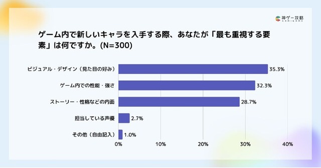 キャラ入手時に最も重視されるのは「ビジュアル・デザイン」が35.3%で最多