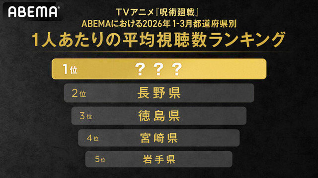 本ランキングでは、2026年1月1日から3月10日までに「ABEMA」で放送したTVアニメ『呪術廻戦』全シリーズを対象に、リアルタイム放送、およびオンデマンド配信での総視聴数を独自集計(※)。1人あたりの視聴数が最も多い都道府県TOP5を初めて発表いたします。