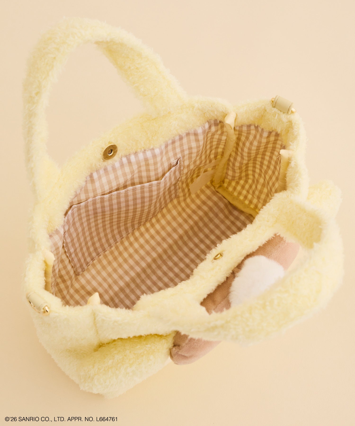 また、ふわふわのファー素材でポムポムプリンの顔を表現したバッグや、おしりをモチーフにしたポーチがラインアップ。2Wayトートバッグの裏地にはギンガムチェック、スクエアトートとポーチには“チームプリン”の総柄を取り入れ、使うたびに世界観をお楽しみいただけるデザインに仕上げました。