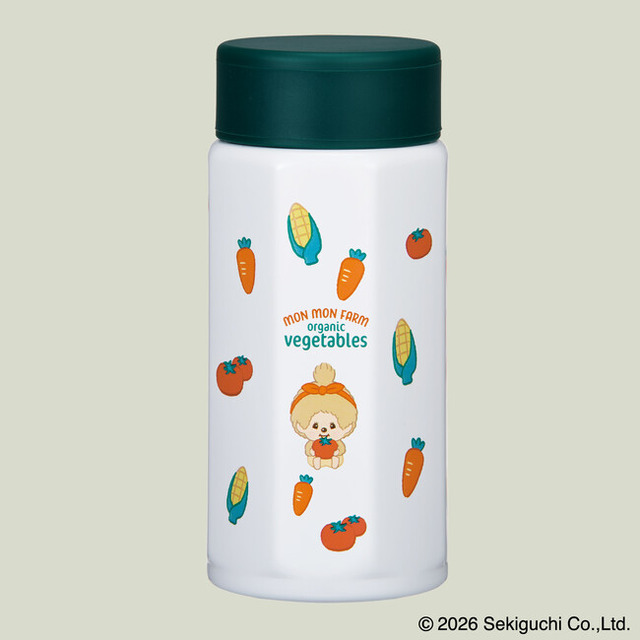 ボトル本体には、「モンチッチ」たちがニンジンやトウモロコシ、トマトなどの野菜に囲まれている様子が描かれています。