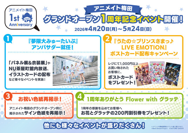 他にも、グランドオープン時に著名人の皆さまよりいただいたサイン色紙の再掲示や「1周年ありがとうFlower with グラッテ」、「『うたの☆プリンスさまっ♪ LIVE EMOTION』ポストカード配布キャンペーン」など様々な施策を実施いたします。