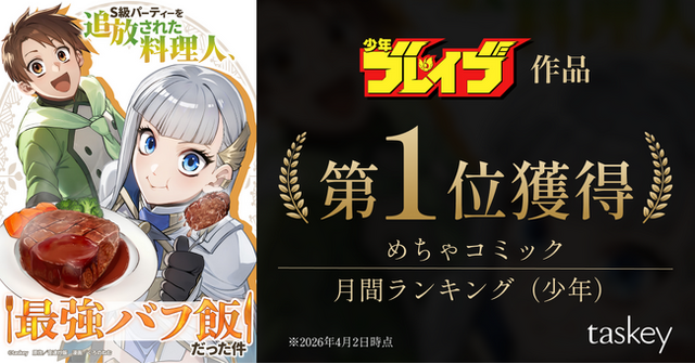 原作開発やマンガ制作などのIP創出事業を手がけるエンタメスタートアップ taskey株式会社(本社:東京都新宿区、代表取締役CEO:大石弘務)は、オリジナルレーベル「少年ブレイブ」の作品『S級パーティーを追放された料理人、最強バフ飯だった件』が、めちゃコミック月間ランキング(少年)で1位を獲得したことをお知らせします。